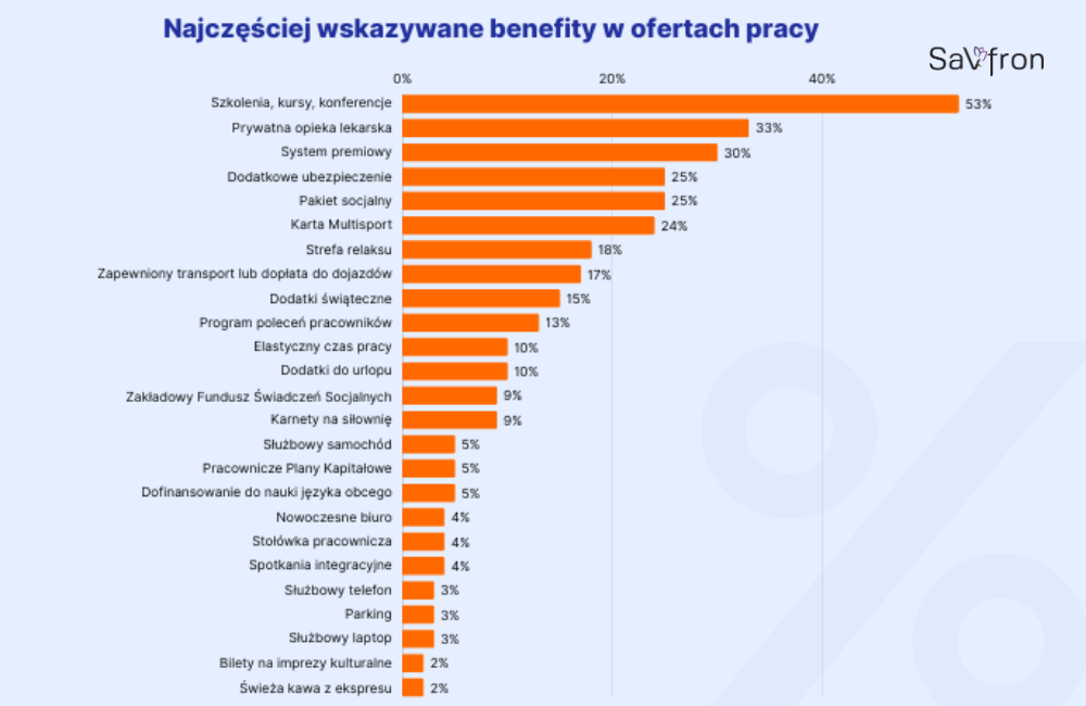 Według raportu Aplikuj.pl o benefitach pracowniczych, analizującego ponad 30 tysięcy ofert pracy, najbardziej popularnymi świadczeniami wciąż są szkolenia i kursy, prywatna opieka medyczna oraz premie. Nieprzypadkowo odpowiadają na najważniejsze potrzeby pracowników: rozwój, zdrowie i poczucie bezpieczeństwa ekonomicznego.